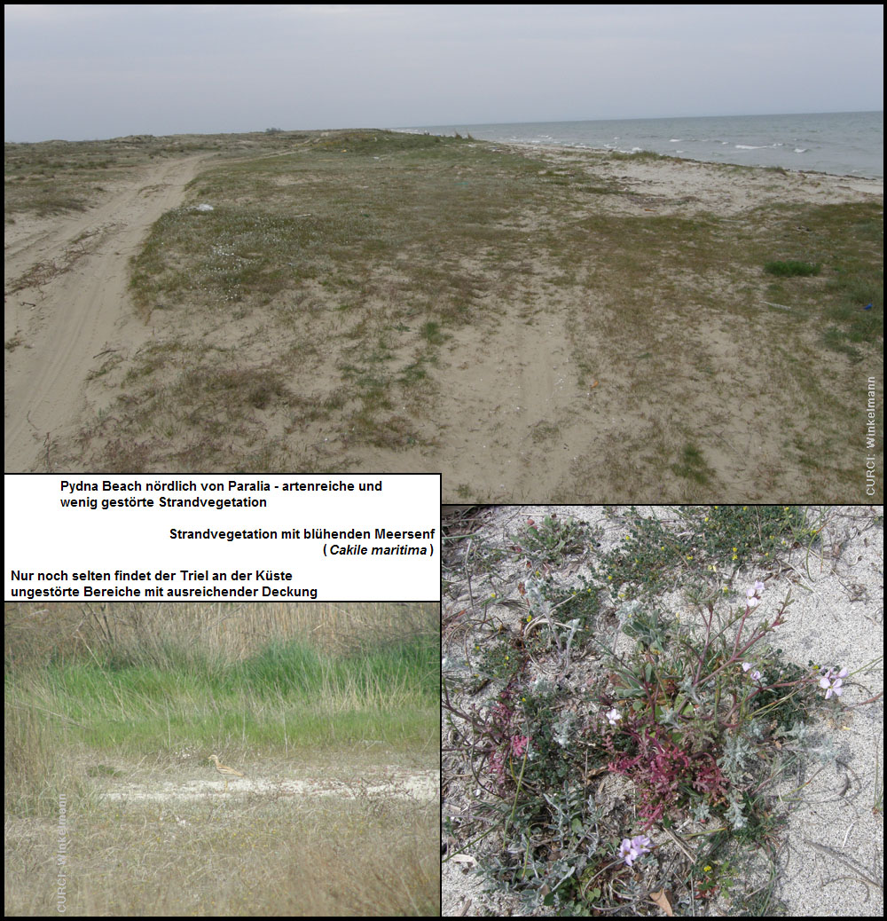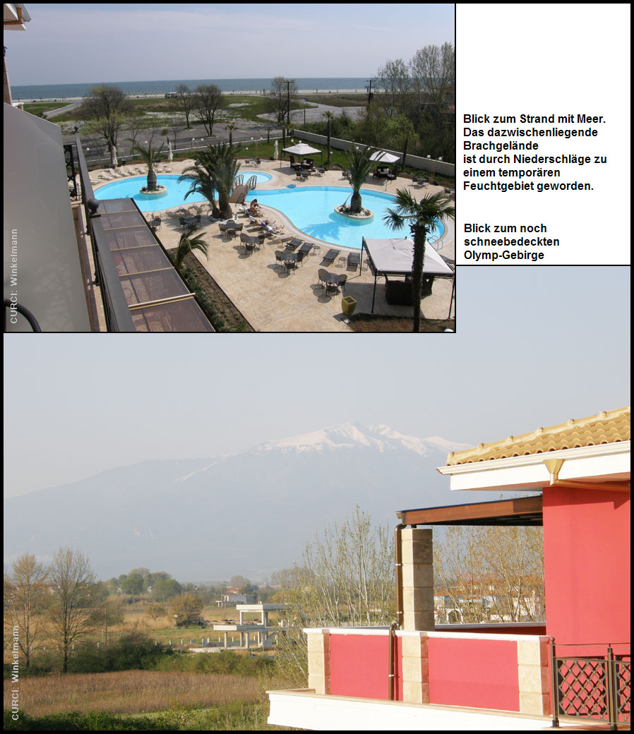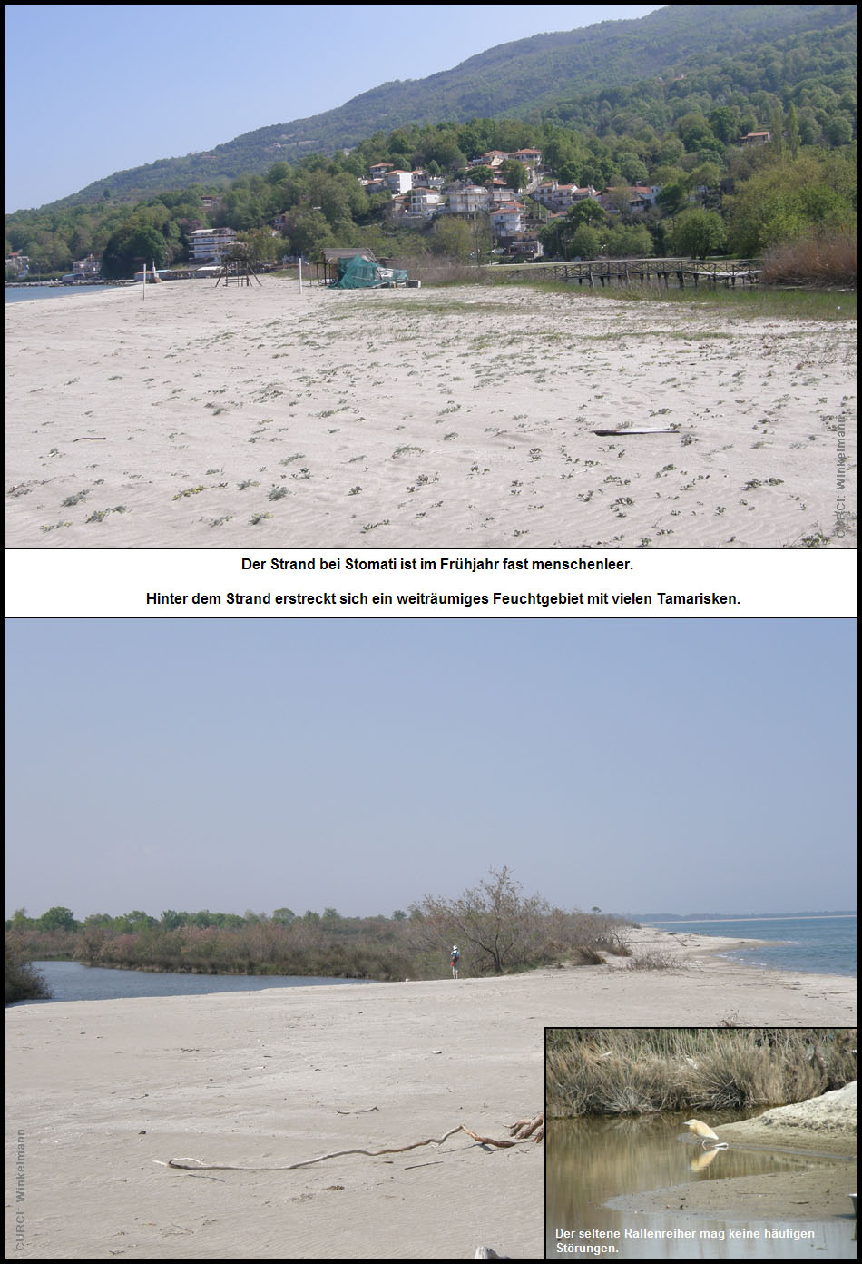 Natürlich bot es sich an, die direkte Umgebung des Hotels [Tab. W50.1] [Tab. W50.2] zu untersuchen, der Strand (Olympic Beach, FO 1) [Tab. W50.3] erwies sich aber als völlig unergiebig, so dass auch schlechter erreichbare Strandabschnitte (FO 4, FO 7 [Tab. W50.4], FO 11 [Tab. W50.5]) aufgesucht wurden. Bei der kleinen Ortschaft Pydna erstreckt sich zur Küste ein größeres Feuchtgebiet (FO 8), das der Salzgewinnung dient. Eine Vielzahl an Vögeln, darunter auch viele Flamingos (Phoenicopterus ruber), nutzen dieses vielfältige Gebiet, dass leider weiträumig abgesperrt und daher nur vom Rand einsehbar ist.