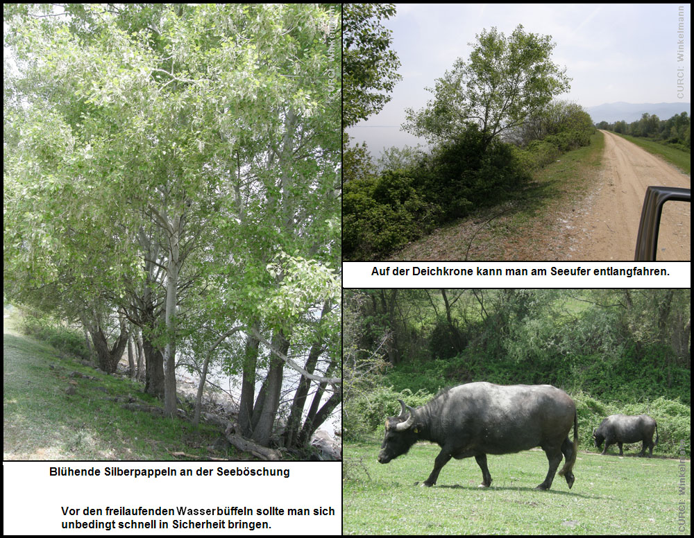 Am letzten Tag (18.4.2009) verblieb bis zum Abflug noch etwas Zeit, und das sonnige Frühlingswetter lockte zu einem Blitz- Besuch des Kerkini-Sees (FO 14) [Tab. W50.12], der durch seinen Vogelreichtum bekannt ist: Unter anderem kommt hier der Krauskopfpelikan (Pelecanus crispus) vor [Tab. W50.12]. Bei einer gemeinsamen Sammelreise (2003) hatten die Autoren bereits einen kurzen Halt am Ufer des Kerkini-Sees gemacht. Wegen der interessanten Sumpfvegetation [Tab. W50.13] wurde dieser Standort für weitere Besuche vorgemerkt. Diesmal waren die Wiesen aber noch weitgehend überflutet, so dass sich die Bäume am Ufer [Tab. W50.14] als ertragreicher erwiesen.
