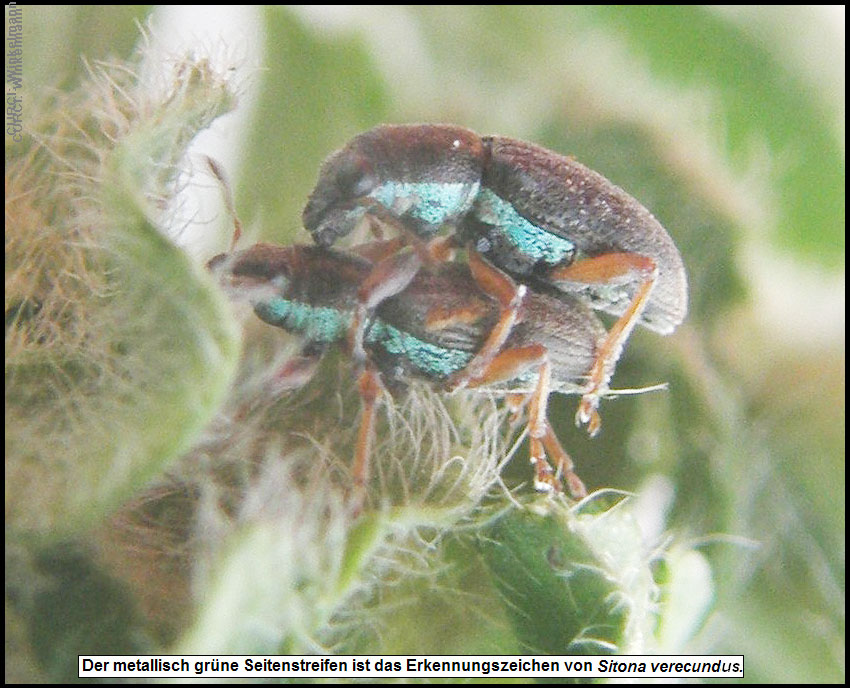 Von allen griechischen Sitona-Arten lässt sich diese Art durch die metallisch grünen Schuppen an den Körperseiten [