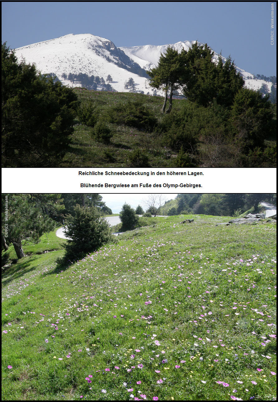 Auf dem Weg ins Olymp-Gebirge gab es bei Litochoro (FO 2, FO 12) [Tab. W50.7] einige blühende Frühlingswiesen. Kalter Wind und die Nässe letzter Regenschauer hielten jedoch die meisten Insekten in ihren Verstecken zurück. Ein Aufstieg ins Olymp-Gebirge [Tab. W50.8] musste nach 3 Stunden abgebrochen werden, da die Schneedecke bis in die Baumzone hinabreichte [Tab. W50.7], wodurch hier noch Winterbedingungen herrschten und keinerlei Insektenaktivität beobachtet werden konnte.