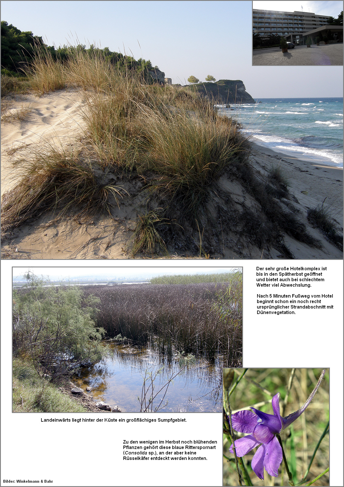[Tab. W70.2] bot sich für die ersten Aktivitäten an. Zunächst erkundeten wir den Strand, der noch in relativ ungestörtem Zustand einigen Küsten- bzw. Sandbewohnern Lebensraum bot. Im Herbst sind typischerweise nur wenige blühende Pflanzen anzutreffen. Dort gab es zahlreiche blühende Exemplare einer Flockenblumenart (Centaurea sp.), die als potentielle Entwicklungspflanzen abgesucht wurden