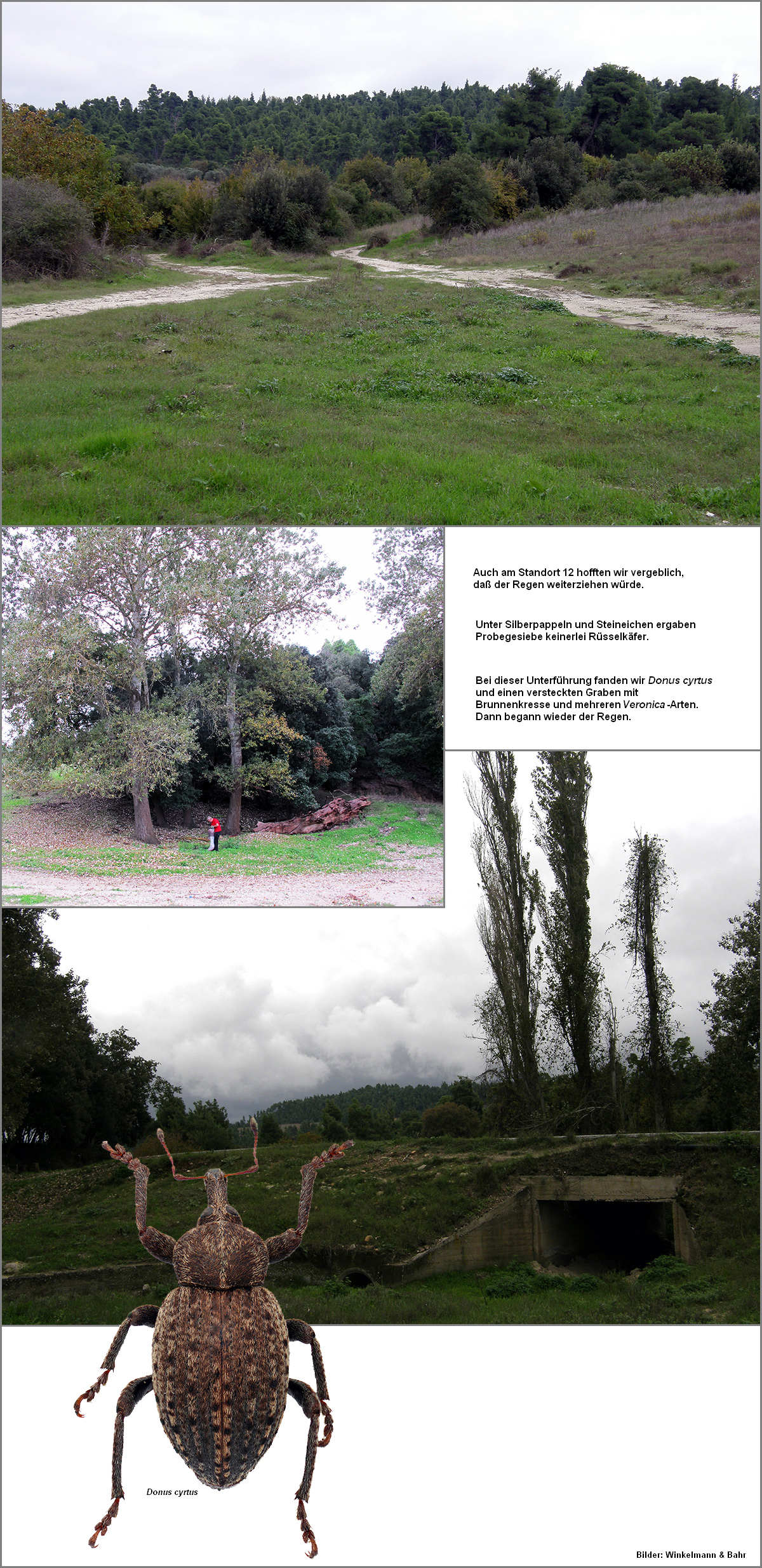 Unsere Bemühungen, durch den späten Reisetermin einige dieser Arten besser nachweisen zu können, wurden durch das ungewöhnlich regnerische, kühle Wetter erschwert. In Gesprächen mit ansässigen Griechen erfuhren wir, dass zu dieser Jahreszeit derartige Niederschlagsmengen nur selten vorkommen. Flüsse und Gewässer führten Hochwasser, die noch nicht abgeernteten Baumwollfelder standen großflächig unter Wasser und verdarben.