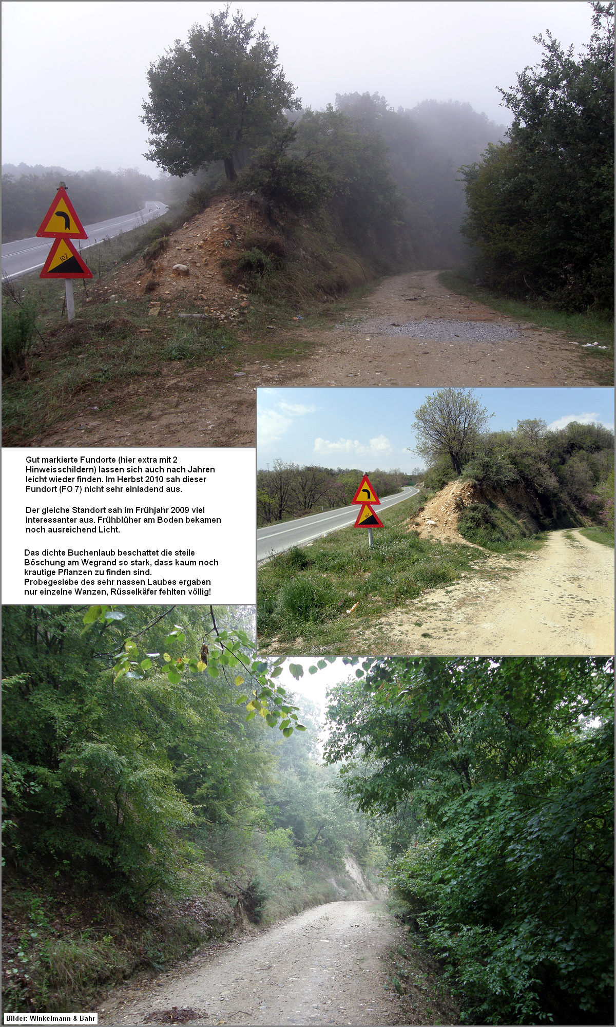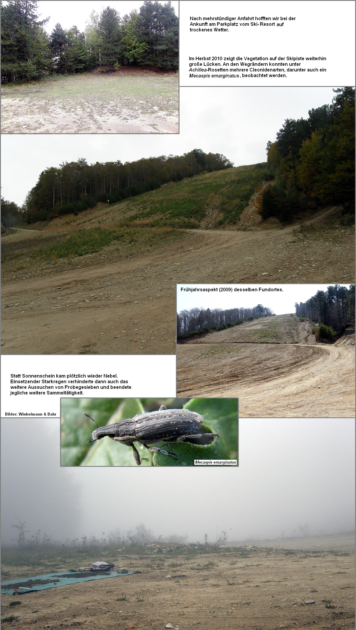 [Tab. W70.5]. Hier schien das Wetter günstig zu sein, denn als die Sonne durch ein kleines Wolkenloch schien, erschienen am Boden unglaublich schnell viele Kurzflügelkäfer (Staphylinidae) verschiedener Arten, die dann auch zahlreich umherflogen. Ganz auffällig war eine mittelgroße Art, bei der die Behaarung der Flügeldecken ornamentartig glänzte. Als die Sonne nach wenigen Minuten wieder hinter den Wolken verschwand, dichter Nebel aufzog und heftiger Regen einsetzte, endete die Aktivität der Kurzflügler schlagartig. Bei der Abfahrt suchten wir einen Fundort (FO 7) der Frühjahrsexkursion 2009