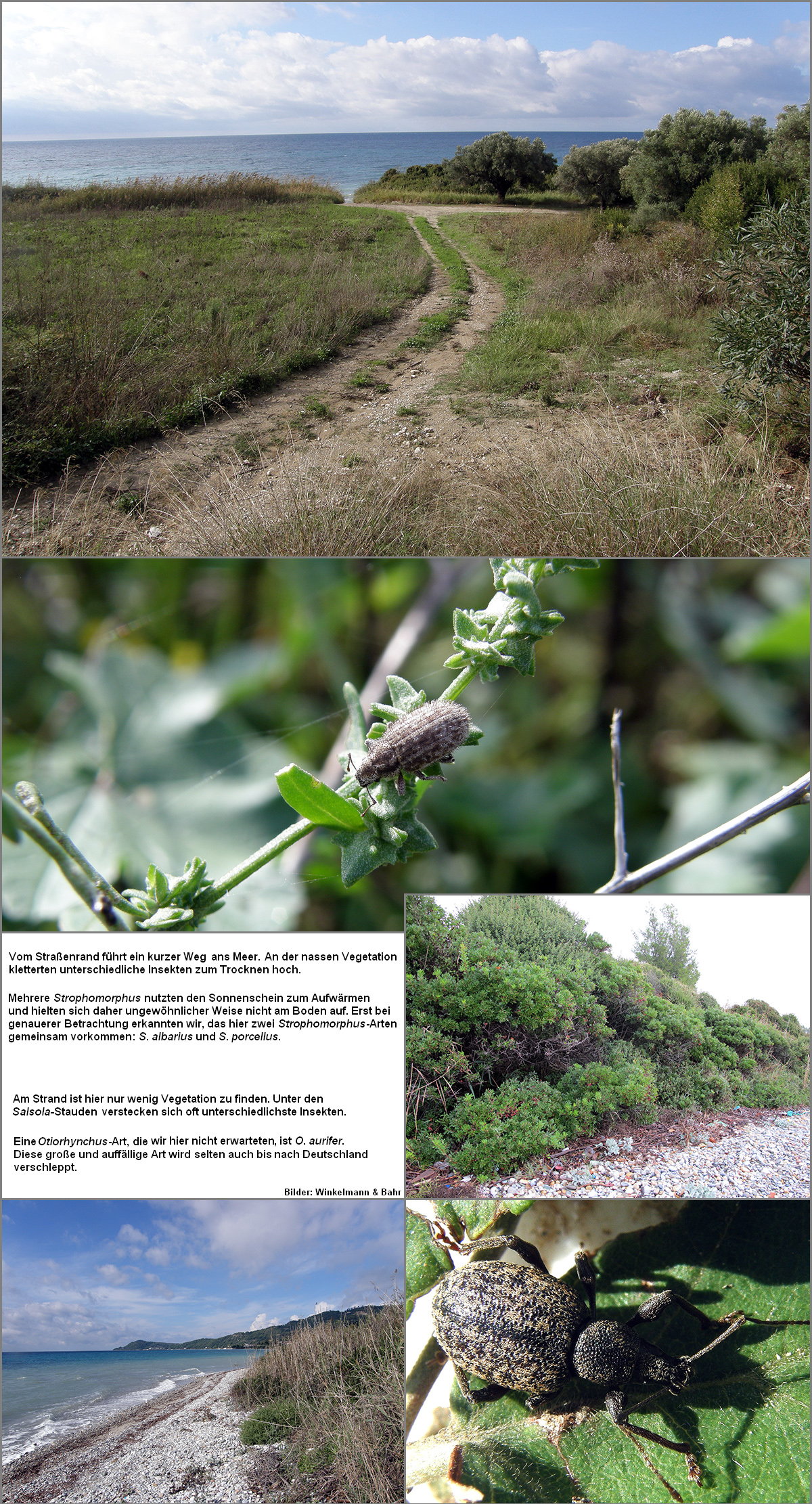 Im Bericht zur Rüsselkäferfauna von Rhodos [Bayer, Winkelmann & Bahr 2007] hatten wir bereits Sitona syriacus Stierlin 1885 ausführlicher vorgestellt. Viel Geduld war erforderlich, um die gut getarnten Imagines im Sand zu entdecken und länger zu beobachten. Bei Sitona cinerascens hatten wir dieses Glück nicht. Da das einzige Exemplar erst bei der Bestimmung unter dem Stereomikroskop erkannt wurde, können keine Angaben zur Lebensweise gemacht werden [Tab. W70.13].