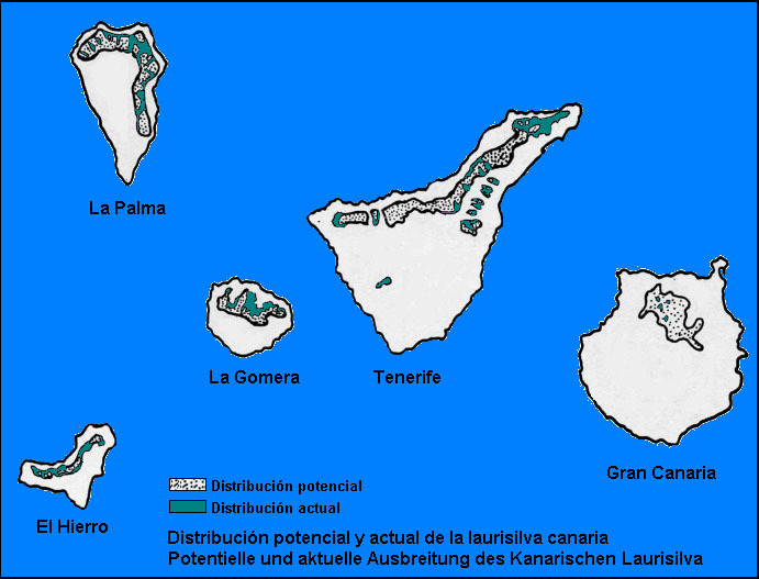 Currently, all the ecosystems belonging to the Canary laurel forest are protected by law, but they only cover less than 10% of its original area [Fig. 77.15]. This forest is highly fragmented in all the islands, with the exception of La Gomera. These fragments form a patchy landscape in which the forest remnants are usually very distant from each other. This biogeographical pattern has detrimental conservation implications.“