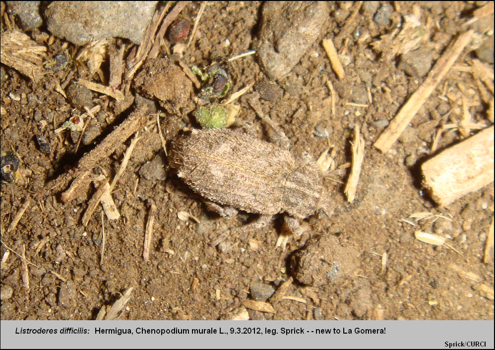 1 Ex.: Valle Gran Rey, La Calera, 28° 05’41”N 17°20’15”, 26 m, beaten from Chenopodium murale L. together with Lixus brevirostris, 5.3.2012, leg. Krátký