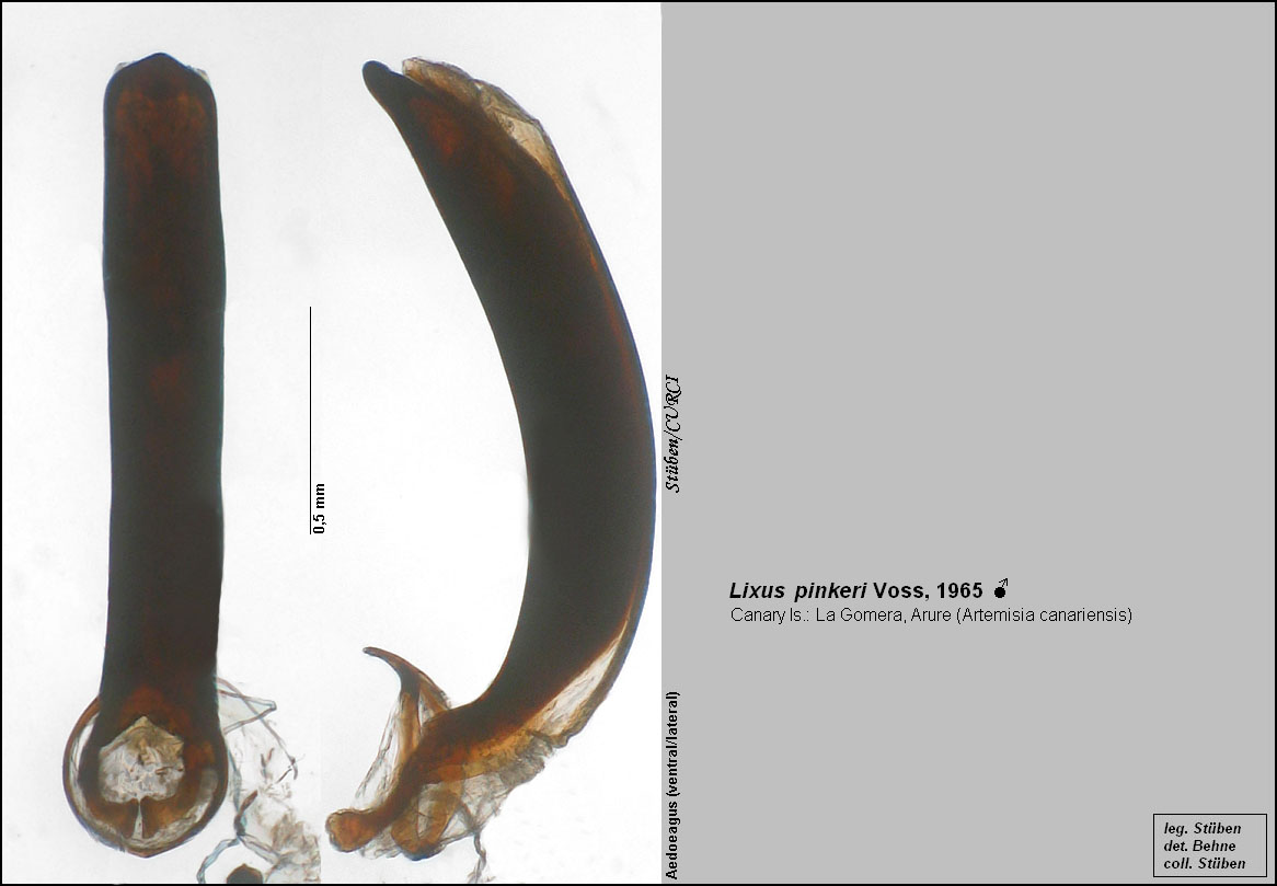 Comment: In my catalogue of La Gomera [Stüben 2011c] the habitus and aedeagus of Lixus pinkeri were, erroneously, depicted by those of an unknown species from Gran Canaria. This is the result of the comparison with the types of Lixus pinkeri Voss, 1965 (col. „Zoologisches Institut und Zoologisches Museum der Universität Hamburg“). The illustrations here show Lixus pinkeri from La Gomera.