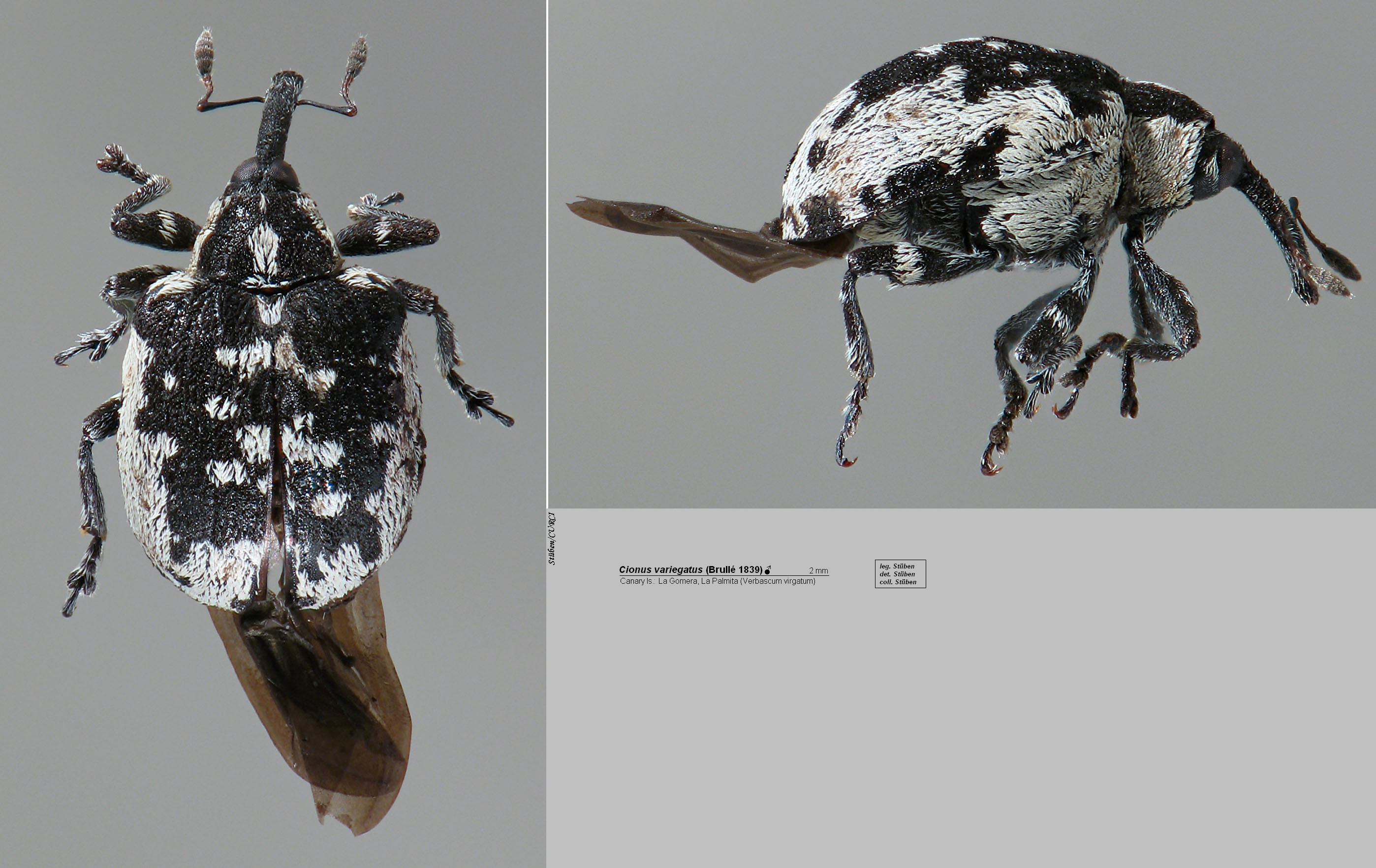2. Erroneously, in the catalogue of La Gomera (SN12/2011: 113) the habitus and aedeagus of Cionus variegatus (Brullé, 1839) were not depicted, but instead those of the monochrome yellow-scaled species Cionus griseus Lindberg, 1958, an endemic species of Tenerife, were shown. The illustrations should be replaced by the illustrations provided above under Cionus variegatus.