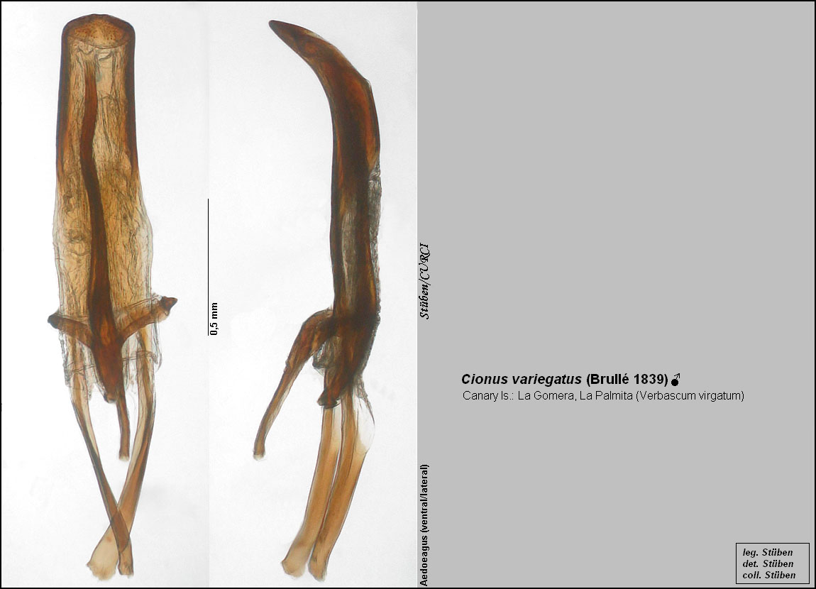 Comment: In my catalogue of La Gomera [Stüben 2011c] the habitus and aedeagus of Cionus variegatus (Brullé, 1839) were, erroneously, depicted by those of Cionus griseus Lindberg, 1958, an endemic species of Tenerife. The illustrations should be replaced by those provided above.